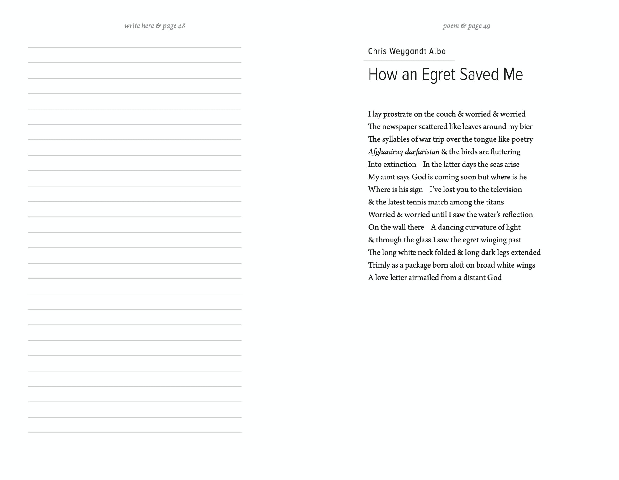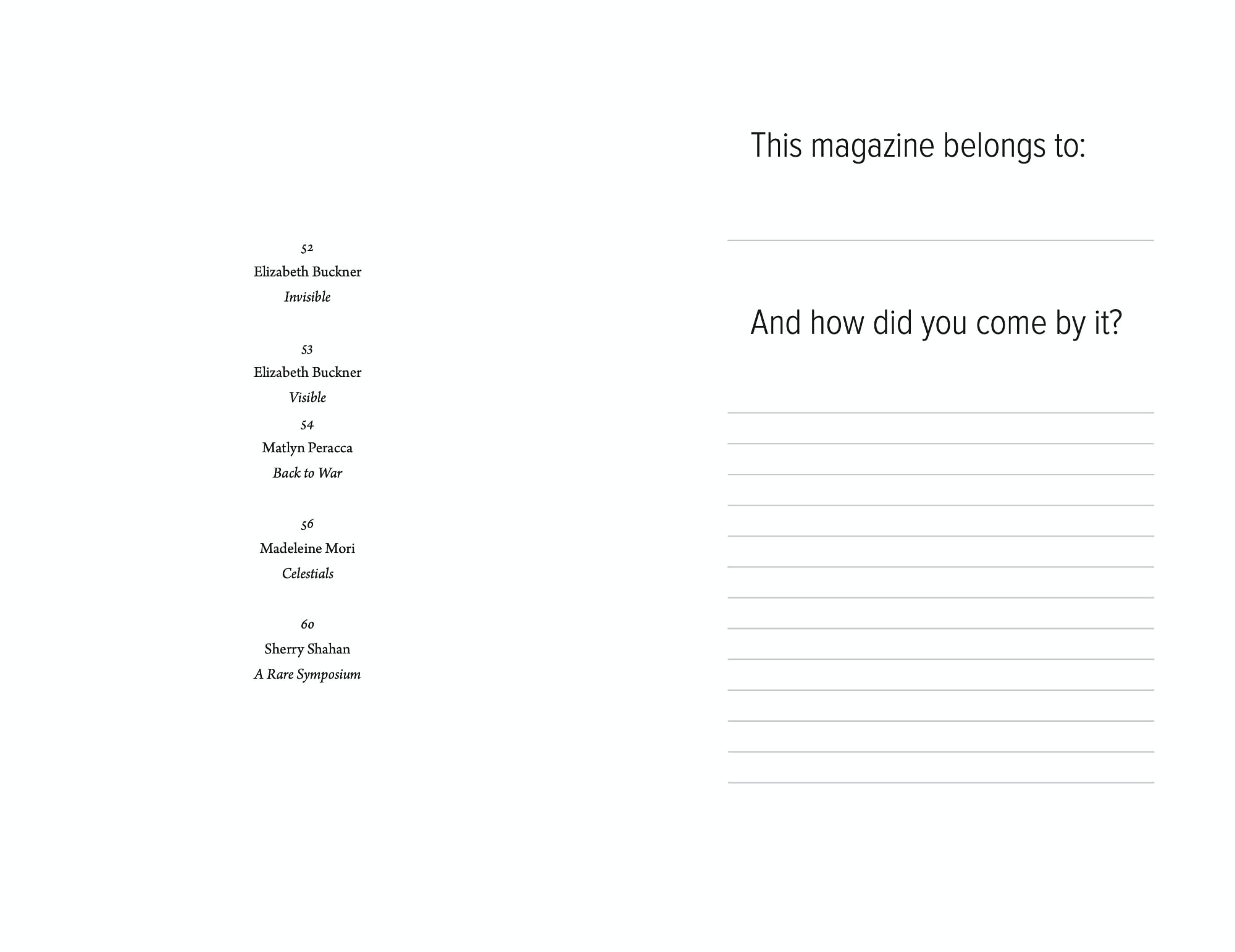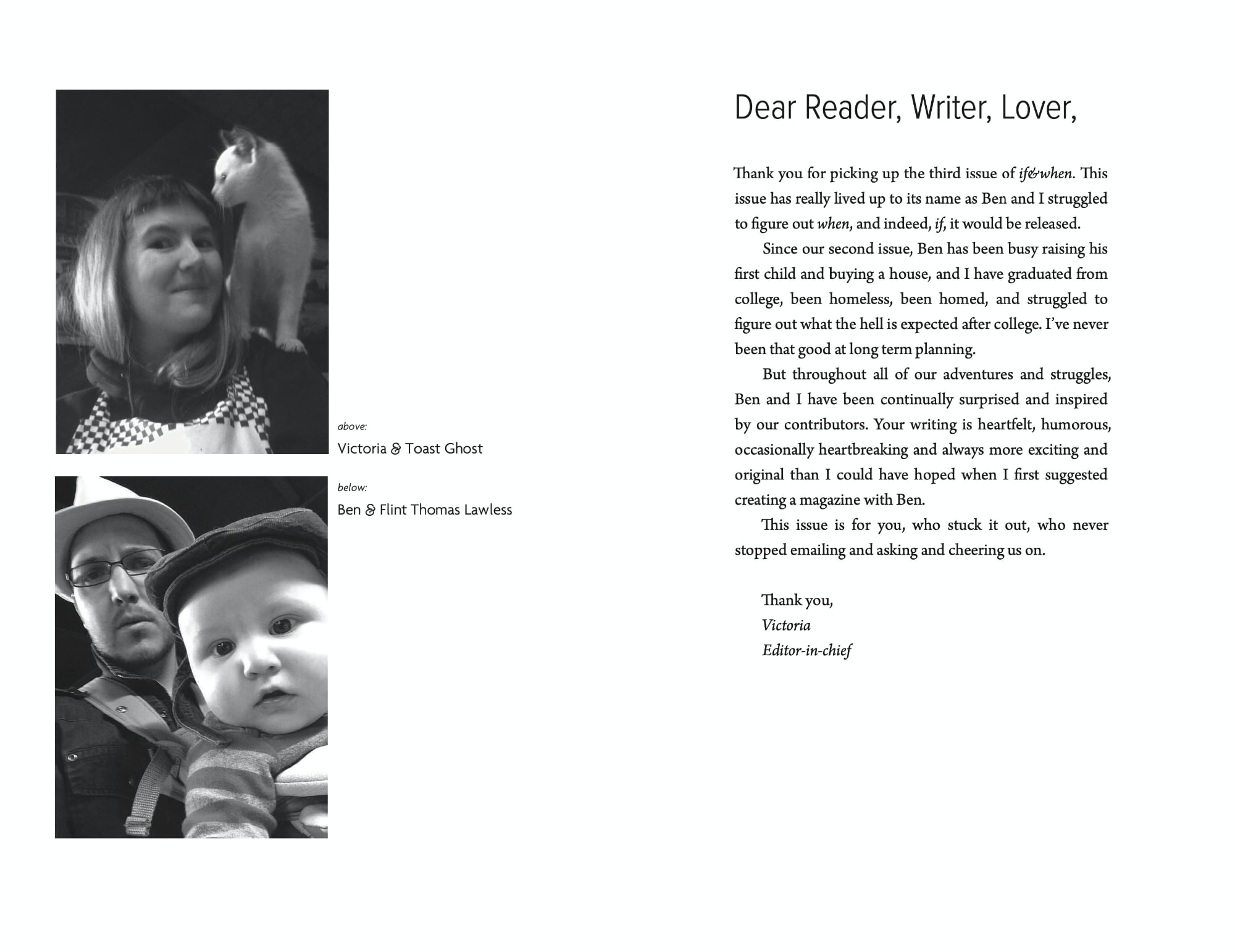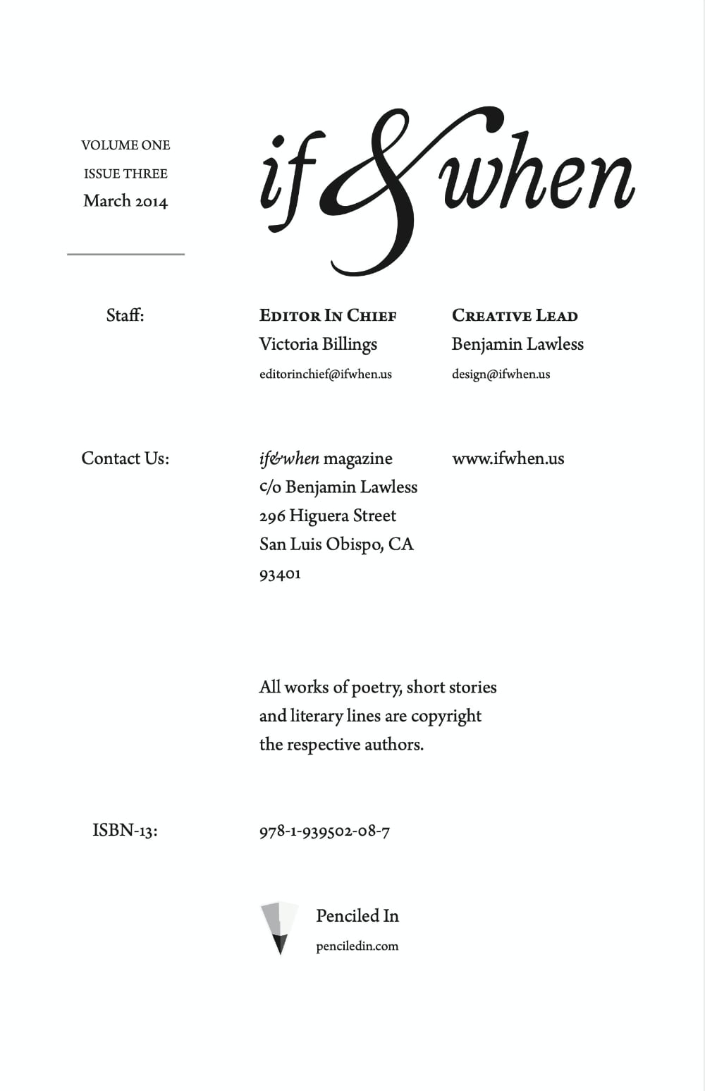 if&when is a “literary journal journal” that aims to not only present creativity, but foster it. To that end, issues include short fiction, short creative nonfiction, poetry and single literary lines, as well as activities and prompts to encourage picking up a pen and writing.