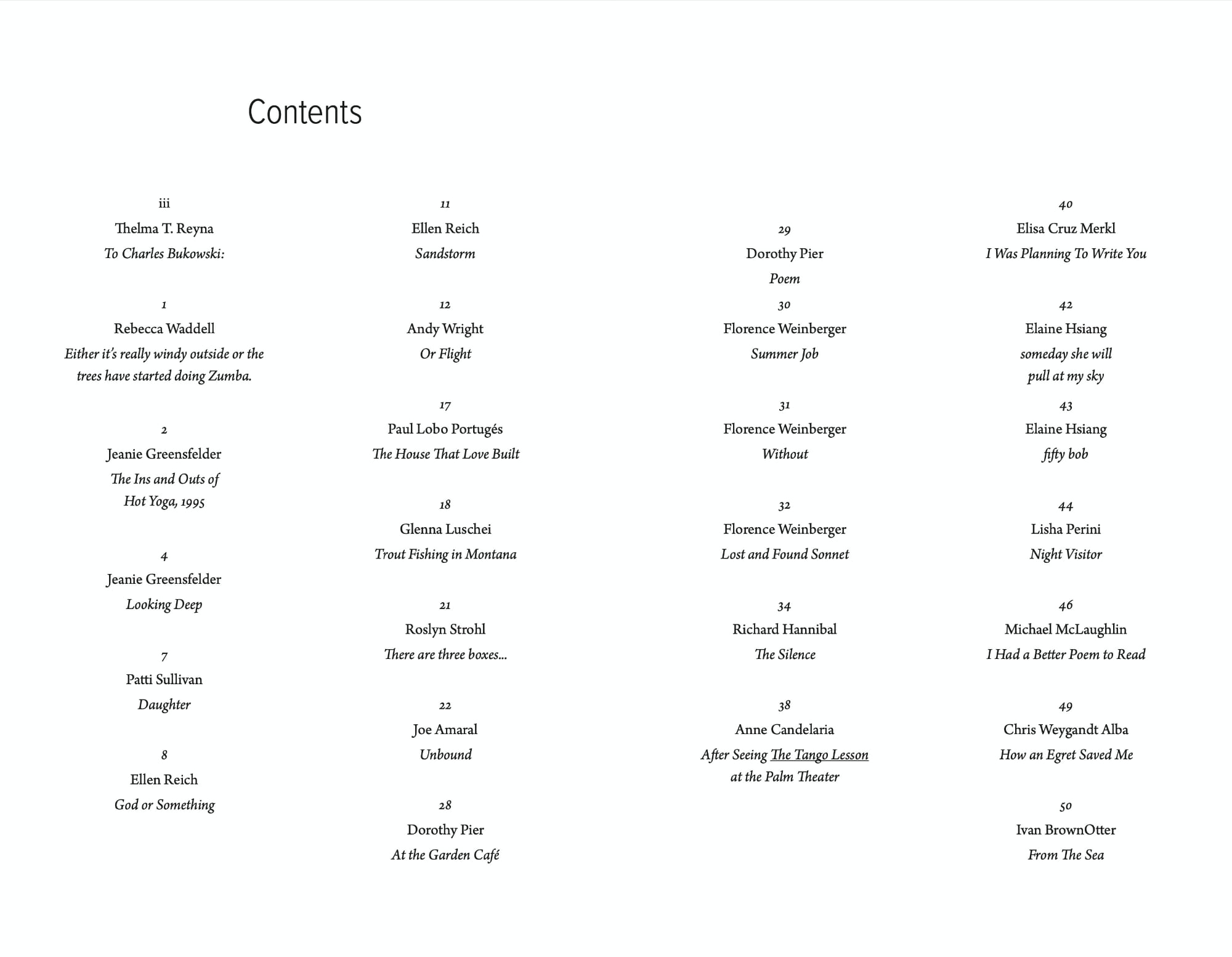 FEATURING WORK BY Thelma T. Reyna, Rebecca Waddell, Jeanie Greensfelder, Patti Sullivan, Ellen Reich, Andy Wright, Paul Lobo Portugés, Glenna Luschei, Roslyn Strohl, Joe Amaral, Dorothy Pier, Florence Weinberger, Richard Hannibal, Anne Candelaria, Elisa Cruz Merkl, Elaine Hsiang, Lisha Perini, Michael McLaughlin, Chris Weygandt Alba, Ivan BrownOtter, Elizabeth Buckner, Matlyn Peracca, Madeleine Mori and Sherry Shahan.