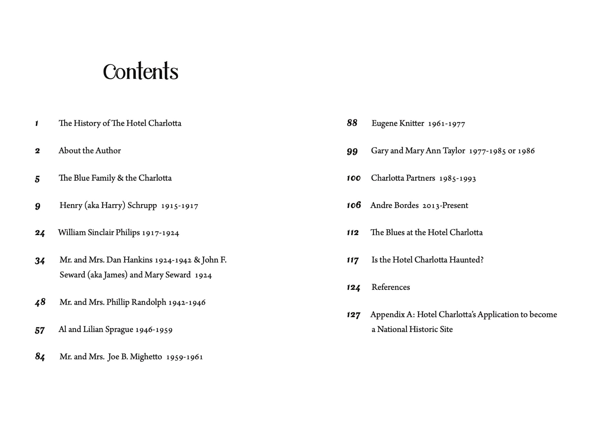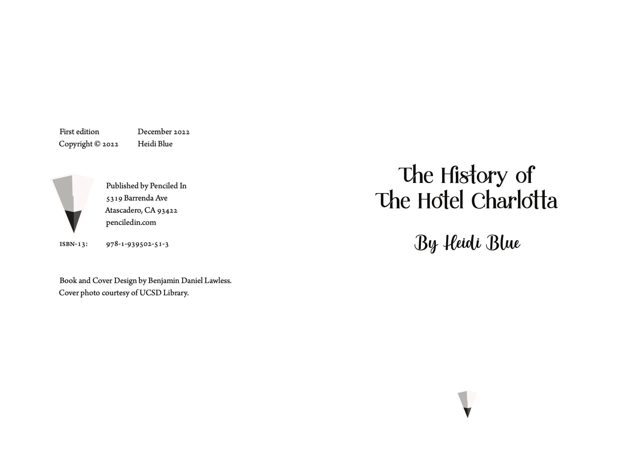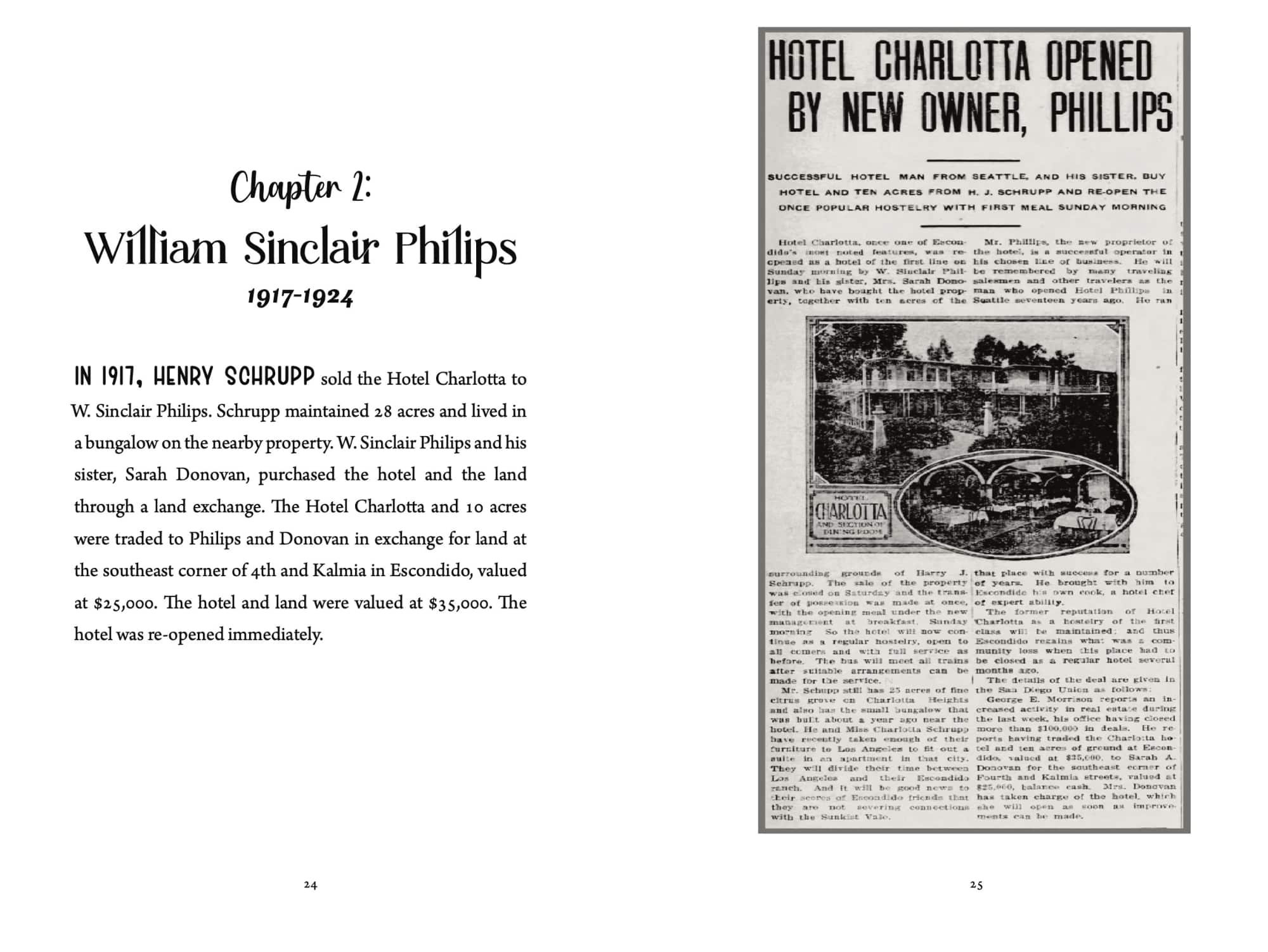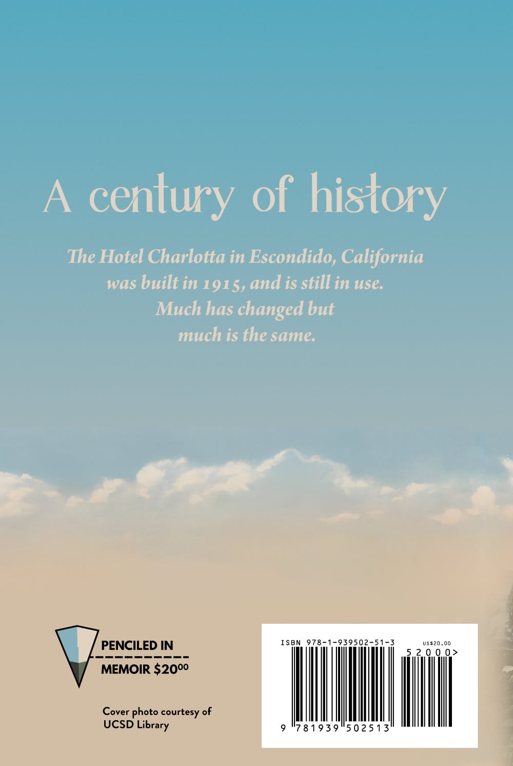 A gathering of historical works about the Hotel Charlotta, official historical site and craftsman-style hotel in Escondido, California. Follow the owners, guests and their families through photos and local newspaper articles from 1915, when the hotel first opened. Experience the joys and sorrows at this beautiful hotel over the course of a century.